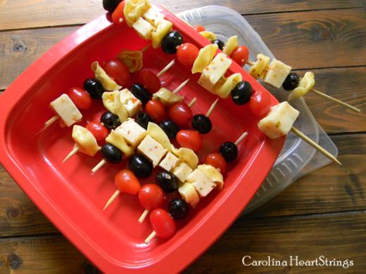 - Take skewer stick and place the tomatoes, olives, tortellini and cheese in whatever order you choose.